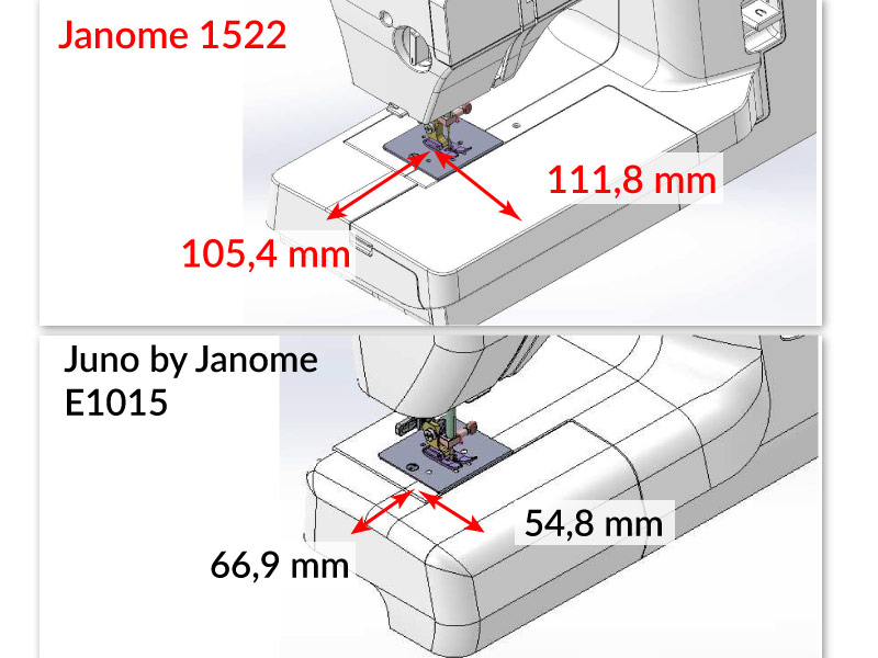 Stroj Janome 1522 má niečo, čo pri žiadnom inom šijacom stroji (v tejto cenovej skupine) nenájdete, tj veľký a veľmi pohodlný pracovný priestor. Čo tu máme presne na mysli? Veľkosť dosky stola meraná naplocho pri stroji Janome 1522 je 105,4 mm x 111,8 mm. Pre porovnanie, Janome Juno E1015 (jedná sa o stroj štandardnej veľkosti) má dosku stola s rozmermi 66,9 mm x 54,8 mm. Rozdiel je veľmi veľký. Žiadny iný šijací stroj nemá takú veľkú, rovnú pracovnú dosku, a teda toľko pohodlia pri šití. Využitie tak veľkého pracovného priestoru v stroji Janome 1522 má ďalšie plus, tj. veľmi veľký a pohodlný úložný priestor pre príslušenstvo, ktorý je umiestnený vo vyššie spomínanej doske stola.
